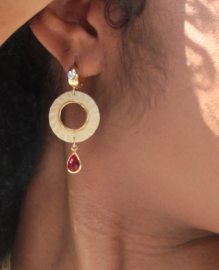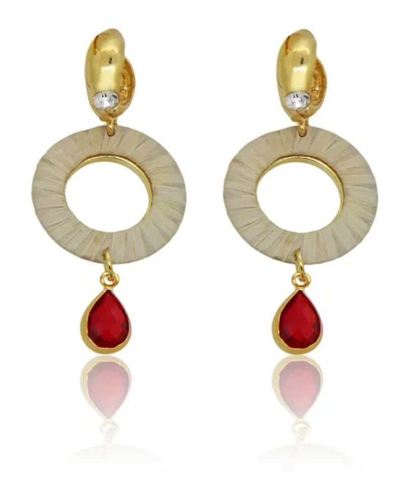 El pendiente colgante volcan está elaborado artesanalmente en paja de burití, metales con baño de oro y resina plástica.