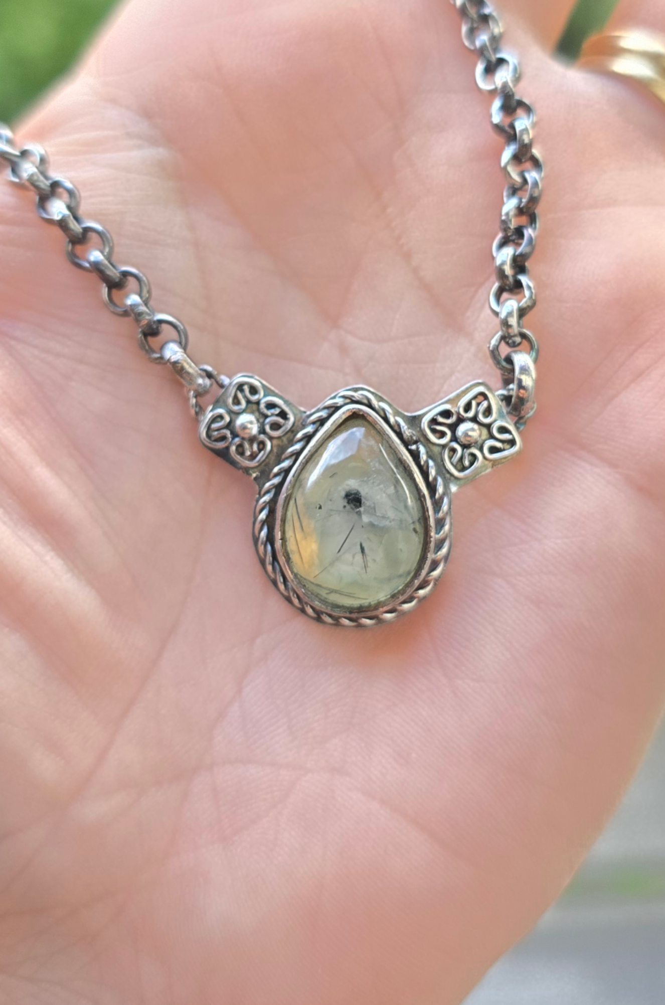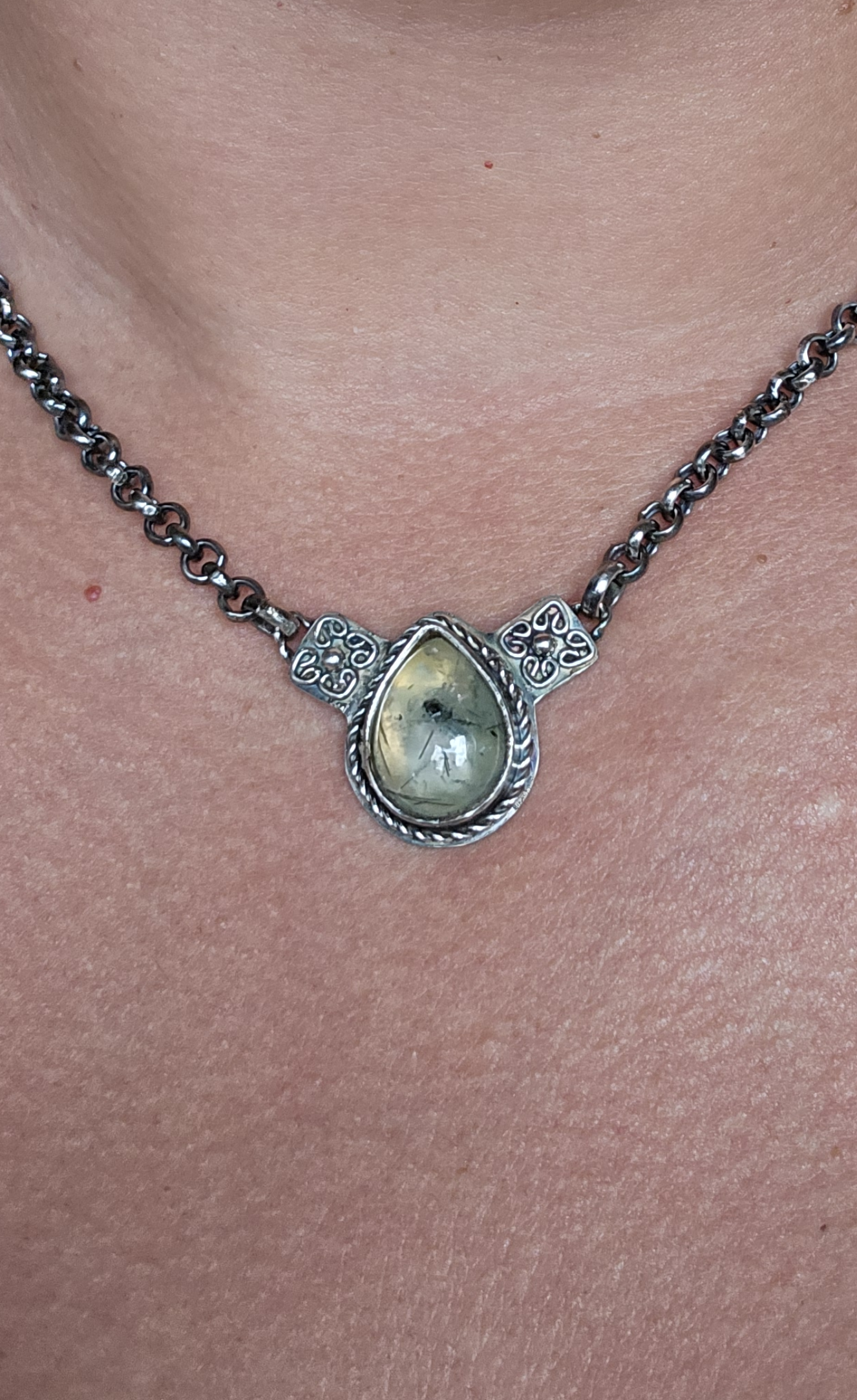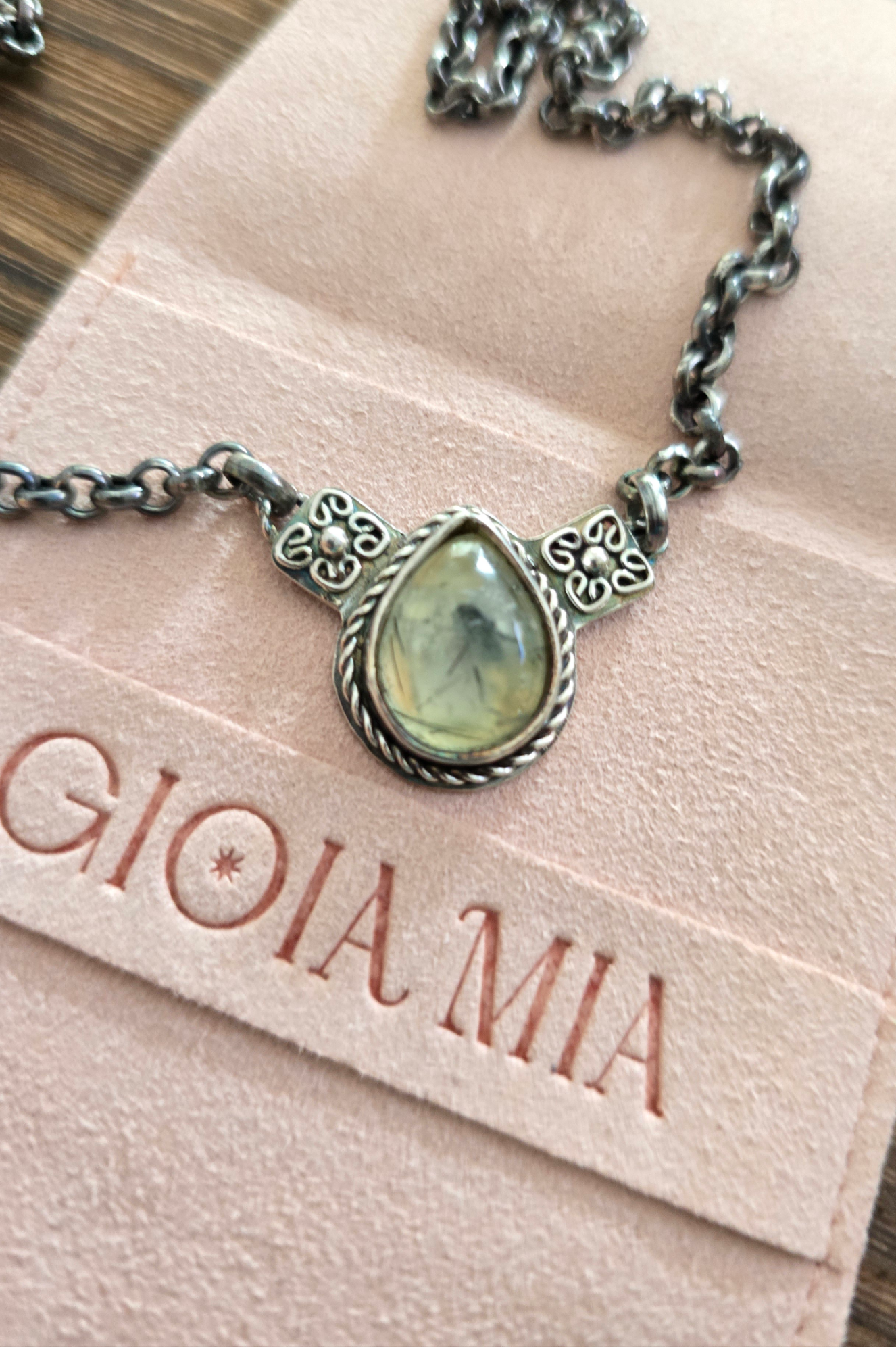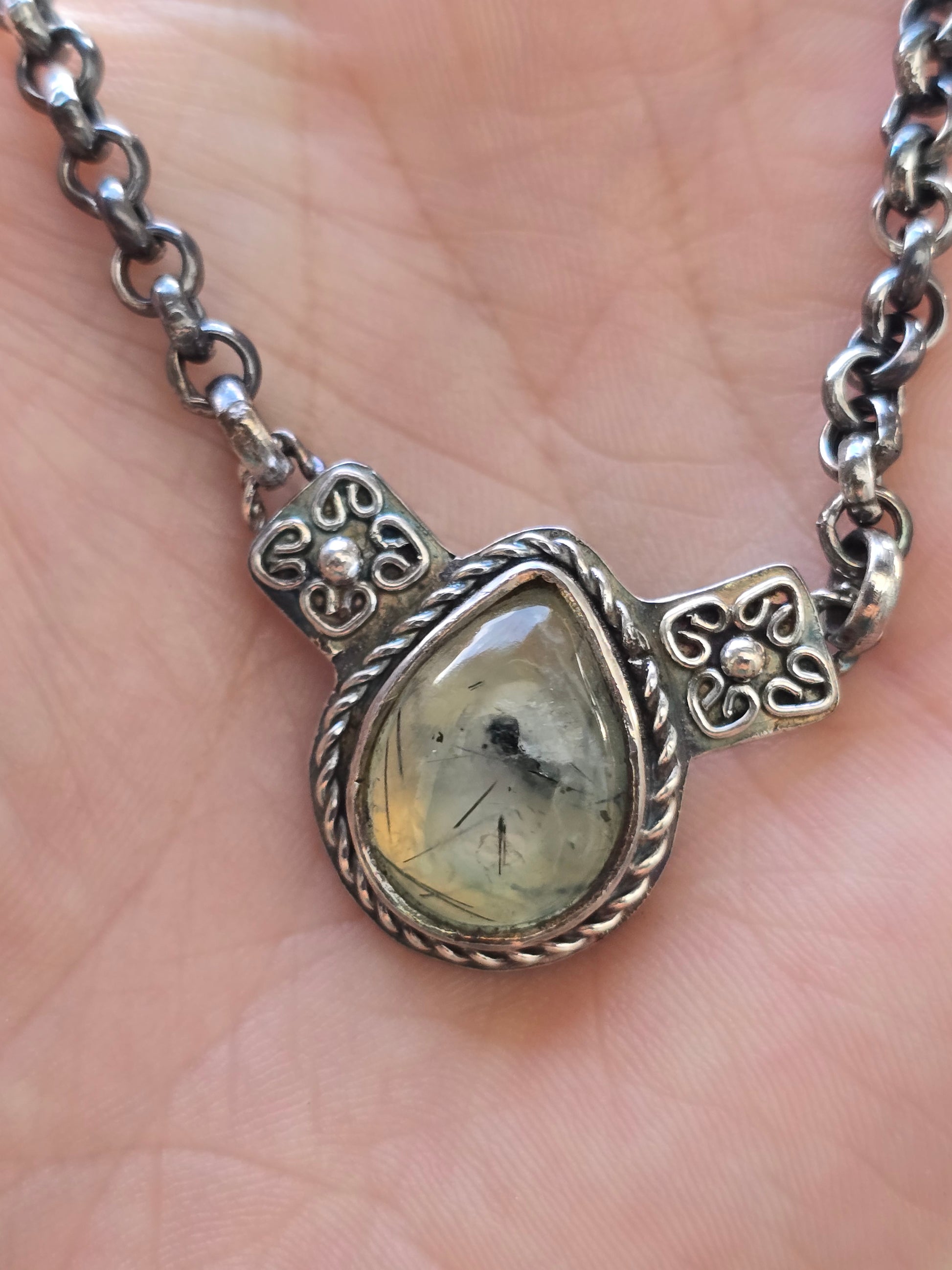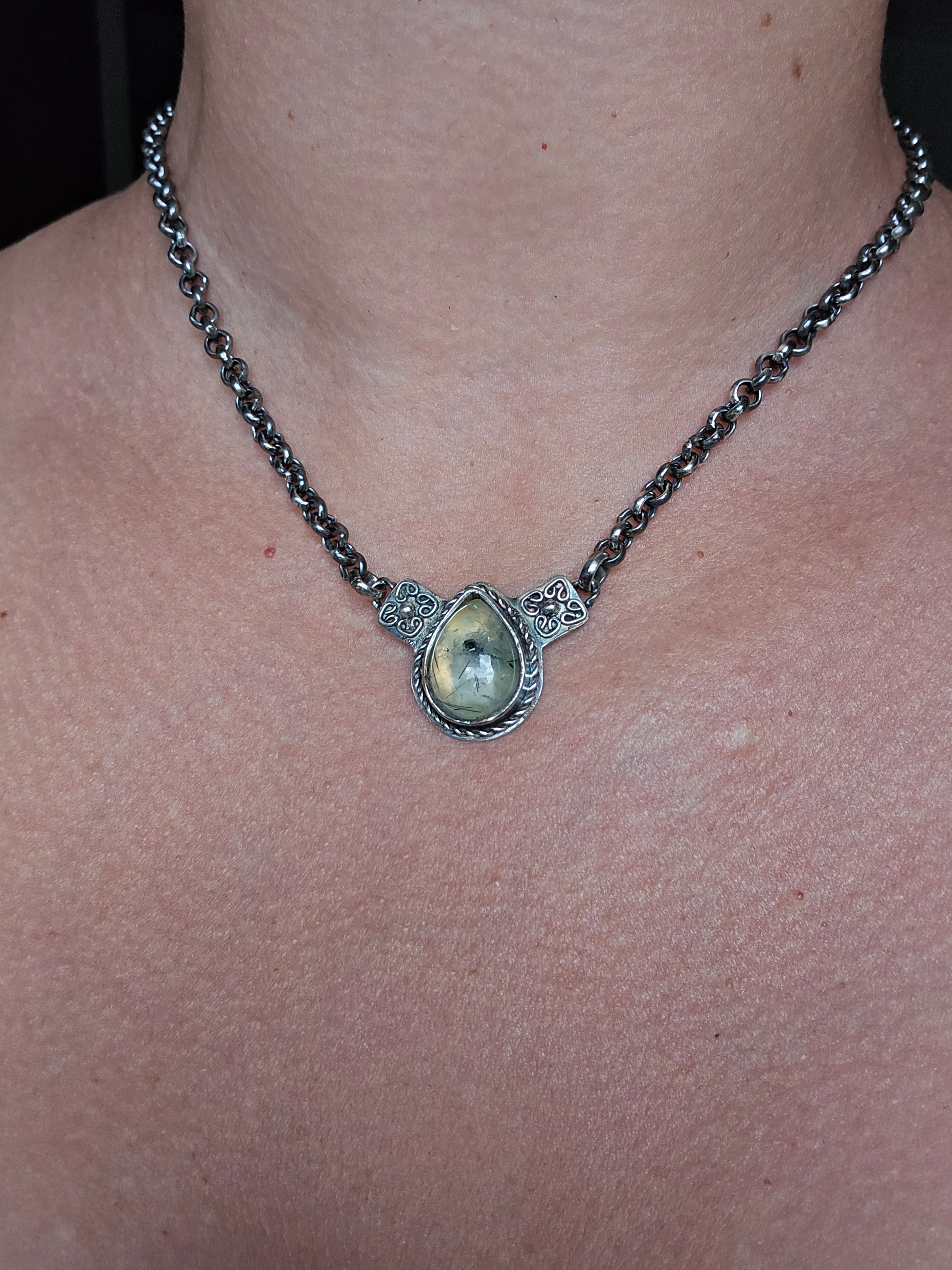 Collar hecho a mano en plata 950 acompañada de una Prehnita