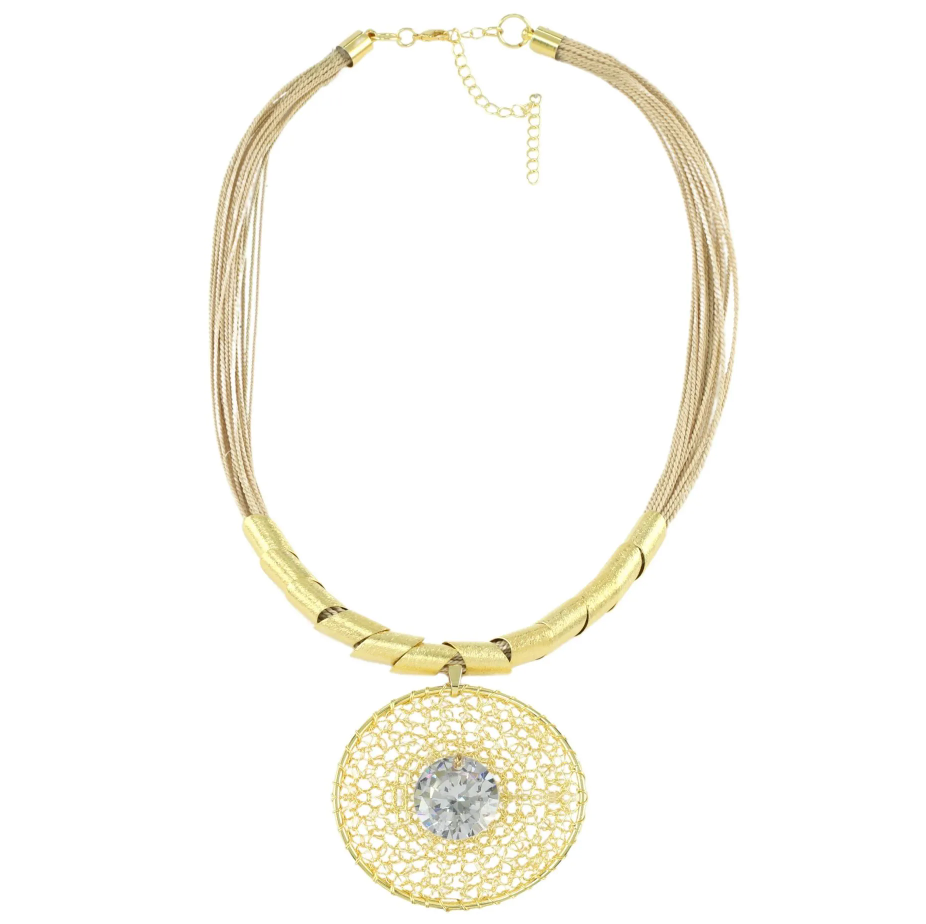La zirconia le da un toque de brillo sofisticado al patrón de ganchillo, esta piedra sintética tiene características que se asemejan a un diamante. El set Crochet Shine es una composición para momentos memorables, compuesto por aretes y un collar tejidos a crochet en alambre de cobre bañado en oro, ¡son verdaderas joyas hechas a mano!